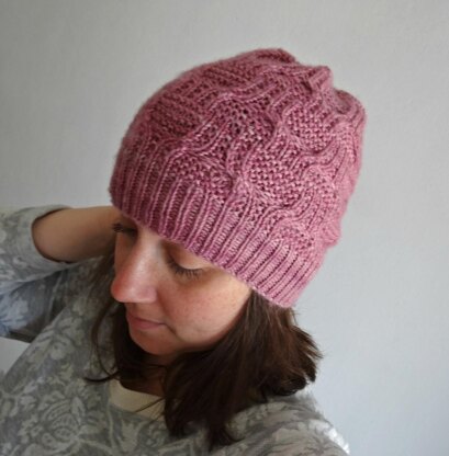 Shown in size small/medium in Manos del Uruguay, color “Estancia”. If you knit the large one, you will have a slouchy version, as shown in blue in Malabrigo Worsted.