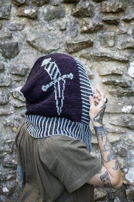 This hooded cowl is knit from the shoulders up to the crown and features a dagger created with faux intarsia. Two color brioche along the front edge, as well as the attached infinity scarf, bring everything together for a medieval themed accessory that also remains modern and functional.