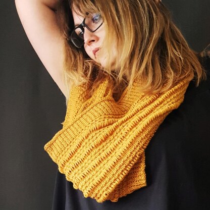 Beautiful cowl with elongated stitches and a play on basic knits and purls create a stunning accessory which can be wrapped double or left long.