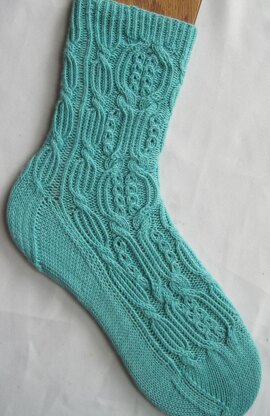 This pattern is for a pair of ornately cabled socks. The focal cable itself is a Japanese cable that is just perfect for socks. The side cables also come to us from Japan. There’s enough “give” to make them comfortable, but enough unusual cabling to make them interesting to look at and fun to knit.