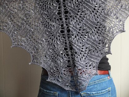 A cloud-like top-down triangular shawl featuring an unusual all-over twisted-stitch lace that naturally forms a scalloped edging.