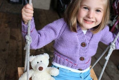Audrey's First Day is a raglan cardigan, knit in one piece from the top-down. Sleeves are separated at the underarm and sleeve sts are held on scrap yarn while the body is completed. Sleeves are then worked on DPNs from the underarm to the cuff. Front band ribbing is created by picking up and knitting sts along garment edge.