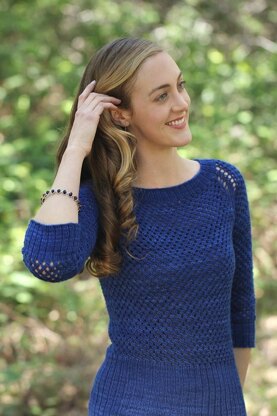 August Sky is a top down pullover worked in an easy all over lace pattern, accented with ribbing, and just warm enough to ward off a summer evening chill. The deep blue color coupled with the lace pattern reminds me of the summer night sky sprinkled with stars.