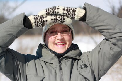These cozy mittens carry a motif inspired by scrimshaw artefacts left by Dorset and Thule peoples who followed after the pre-Dorset cultures. They are worked at a fairly tight gauge in worsted weight yarn to increase their warmth and wind resistance, an excellent choice for hikers and campers in the far North of Canada.