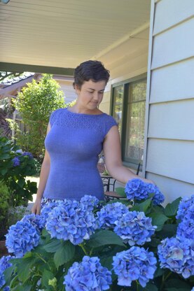 Designed specifically to flatter the hourglass figure this tee is knit all in one piece and worked from the bottom up. The cap sleeve is flattering and requires no joining of pieces. A pretty peacock lace adorns the neck and sleeves providing interest. The shoulder has raglan shaping with clear instructions for decreasing in pattern. Short row shaping information is provided for A-DD cups in the bust and gives the perfect fit, waist shaping hugs the body to flatter curves. This simple and elegant tee can be worn casually on a daily basis or dressed up for special occasions. We recommend you choose a size with zero – 3” negative ease.