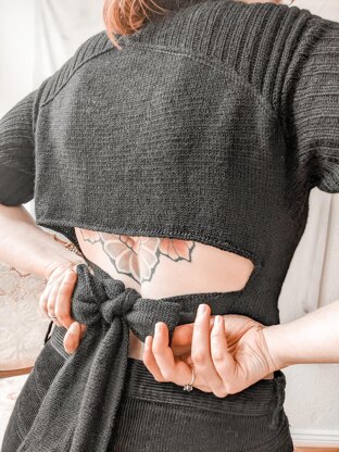 The Auri Shirt is a cropped shirt that is worked seamlessly from the top down. It features a beautiful cutout at the back, which can be closed at the hem with the help of two ties. It has a straight cut and a high collar.