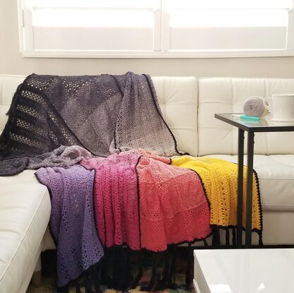 Using four of the five Scheepjes Whirls from the Aurora Collection, the Aurora Blanket is constructed in four panels, one of them with join-as-you-go motifs and the other three in turning rows. Scheepjes Whirlette was then used to join, border and add tassels (optional).