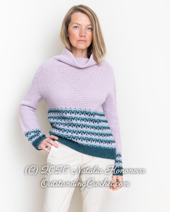 Materials: Scheepjes Metropolis yarn (75% Merino extra fine x 25% Nylon, 50 g / 200 m / 218.7 yds, 4 ply / Fingering weight), 8 (9, 9, 10, 11, 12, 13) skeins / 400 (450, 450, 500, 550, 600, 650) g / 1750 (1969, 1969, 2187, 2406, 2625, 2844) yds in Almaty / lilac, 2 (2, 2, 2, 2, 2, 2) skeins / 60 (65, 70, 75, 80, 85, 95) g / 263 (284, 307, 328, 350, 372, 416) yds in Marseille / light turquoise, 3 (3, 3, 3, 3, 4, 4) skeins / 115 (120, 125, 130, 145, 155, 170) g / 503 (525, 547, 569, 635, 678, 744) yds in Multan / dark turquoise colors.