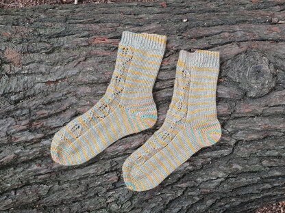 As temperatures decrease, trees change colour and shed their leaves. The falling leaves served as inspiration for this pattern. These top-down socks feature a twisted rib cuff, an elegant lace pattern resembling falling leaves, a short-row heel and a rounded toe. These socks will be the perfect companions for sunny autumn days.