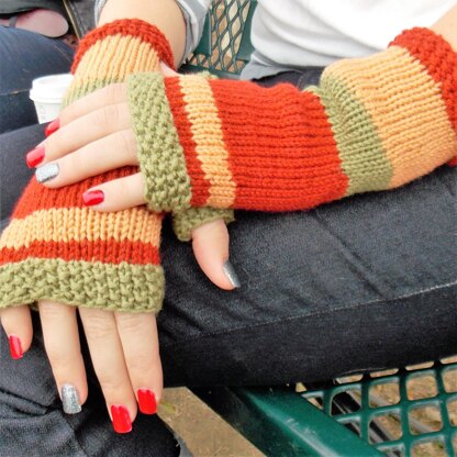 Skills needed for working the mitts are working in the round, k/fb, knit, purl, and adding a new color. The Autumn Fingerless Gloves worked using Berroco/Touché; 50% Cotton/50% Rayon. However, any worsted weight yarn will do. Berroco Vintage has lots of fantastic colors for you.