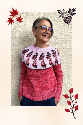 This jumper pattern has a loose fit. It comes in eight different sizes. It is a top-down, circular yoke featuring stranded colorwork. The colourwork chart is read from right to left, bottom to top. The positive ease is about 5 cm / 2” to 10 cm / 4”.