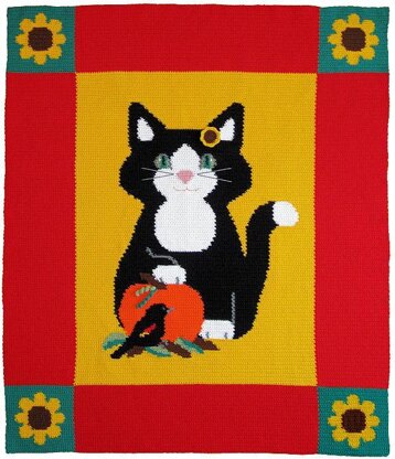 Part of a series of four season kitty afghans. Cute Autumn Kitty with a Pumpkin, Red-Winged Blackbird and Sunflowers (including one on her head). Large color change graphs to follow in all regular single crochet stitches.