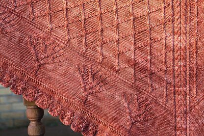 This is a triangular shaped shawl, worked in two pieces, from the bottom up. The leafy edging of the shawl is knitted first. Then after picking up stitches along the side of this edging, the tree patterned border is knitted before moving onto the trellis pattern of the shawl body.