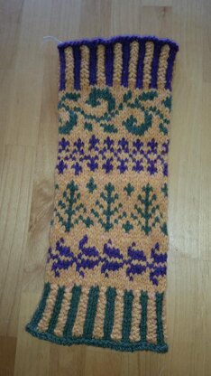 Reminiscent of an autumn wood these legwarmers are a quick knit and a great first colourwork project. Worked in three colours you will have plenty of leftover yarn for other accessories.