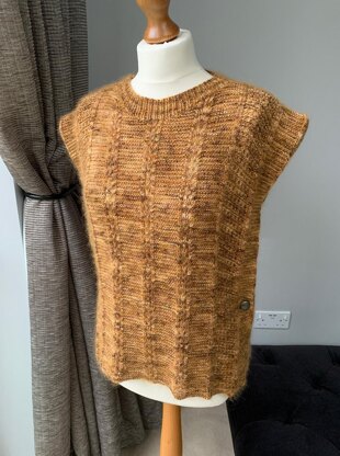 This poncho is knitted using speckled 4ply yarn held with a strand of mohair. I used Colliston Yarns in Auchmithie and Drops Kid Silk in Curry to highlight the gold specks in the yarn. Both sides of the poncho are knitted flat. The front section has neck shaping and two buttonholes. The neck stitches are then picked up from both sides and knitted in the round (or can be knitted flat and joined after). The only finishing required is joining the shoulder seams and sewing the buttons on.