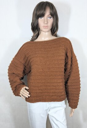 This is a comfortable oversized, boxy sweater makes up fairly quickly with bulky yarn and larger knitting needles. Worked in the round, the length is easily adjustable by adding or subtracting rounds in the body section. Requires basic knowledge of knit and purl stitches, and the only seams are at the shoulder! Sweater shown is a size M/L on a size 6 model.