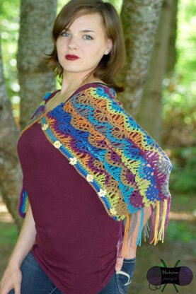 The Autumn Sky Wrap is a quick and easy one-piece wrap. It features lacy ripples worked sideways and a light fringe for a fun design. Add fun buttons for extra personality!