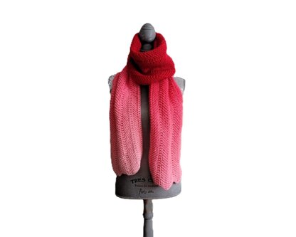 The Autumn Sunrays Scarf is long enough to style in many ways. It is made with 2 balls of gradient yarn, creating an ombre effect; knitted with a textured chevron stitch. The 90% acrylic 10% nylon medium worsted yarn is soft to the touch. The written pattern includes a chart and photos.