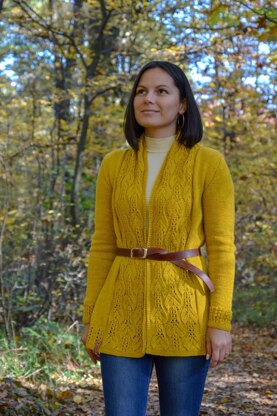 **Autumn Symphony ** is a comfortable, wardrobe basic with delightfully lace shawl collar. Worn belted or hanging loose. Is worked as a top down with a lace shawl collar.