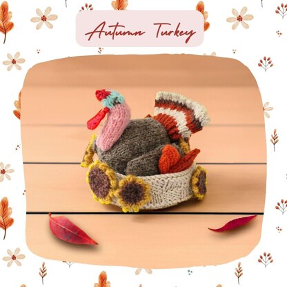 Finished size: basket 11cm diameter, turkey, 8cm, flower, 3 & 4cm All parts are knitted flat and sewn up in the end. To maintain its shape, a cardboard disc is placed inside the basket. 6 pages Yarn DK Wool (8-ply) yarn Small amounts in less than 10g each • [A] Brown • [B] Pink • [C] Red • [D] Green • [E] Orange brown • [F] Oatmeal • [G] Dark brown • [H] Sky blue • [J] Orange • [K] Yellow DK Cotton yarn • [M] Oatmeal