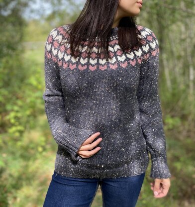 Yarn: Knit Picks City Tweed DK 55% Merino wool, 25% Superfine alpaca, 20% Donegal tweed, 123 yards per 50 grams Main colour: Obsidian (Charcoal) Contrast colour 1: Snowbank(White) Contrast colour 2: Primrose (Pink)