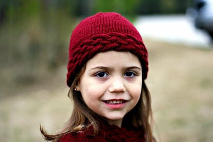 The hat can be knit with most worsted weight yarns, and the pattern includes the cable chart needed for constructing the hat brim. The hat coordinates perfectly with the Avalon Cabled Cardigan.