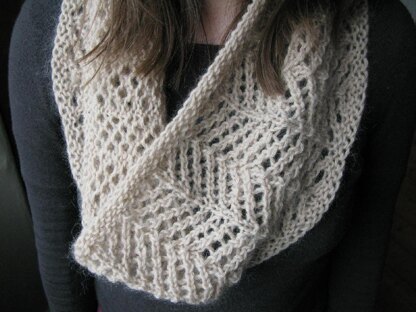 A beautiful lace cowl in a lovely fuzzy yarn. An understated lace design which could be dressed up or down, it would go equally well with jeans and a t-shirt as with evening dress. The pattern is simple and elegant, pretty but not too fussy.