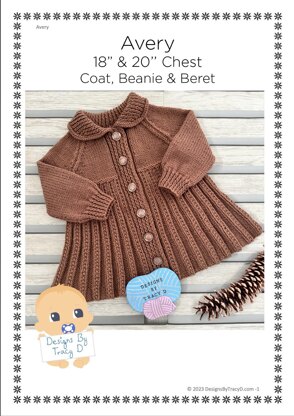 Avery is a knitting pattern for a little coat, Beanie and Beret to fit baby's 18" chest (0-3mths) and 20'' chest (3-6mths). It is a very straightforward 2-row pattern made using DK yarn with 3.25mm & 4mm needles for the 0-3mth size, and DK yarn with 3.75mm & 4.5mm needles for the 3-6mths. You will need 200g of DK yarn to make the set.