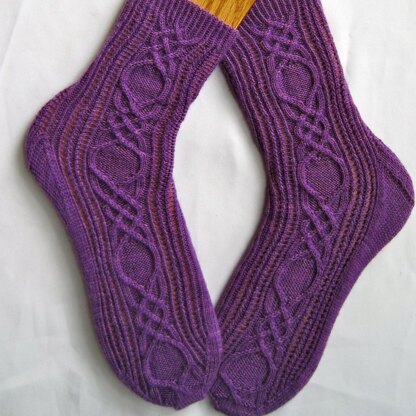 This pattern is for a pair of ornately cabled socks. The cable itself is a Japanese cable that is just perfect for socks. There’s enough “give” to make them comfortable, but enough unusual cabling to make them interesting to look at and fun to knit.