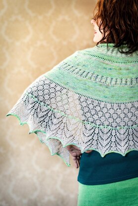 Worked in luxurious cashmere and merino yarn, this pretty, half-pi shawl is worked from the top down. A border of delicate lace patterns creates a dramatic effect contrasting with garter stitch. Both charts and written instructions are given for the lace patterns.