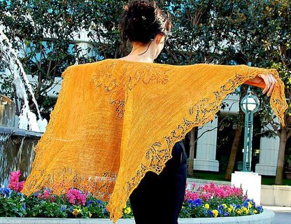 This is a pattern for an half hexagon shaped shawl. It is knit from the top down with complex lace stitches and stockinette. The shawl's leaf motif lace falls beautifully, and most securely, on one's shoulders.