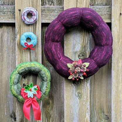 This holiday wreath uses slipped stitches to create a festive tufted-look wreath. Instructions are given for 3", 8" and 14" wreaths, but vary your yarn and needle size to make the size you want. Small uses fingering weight yarn, Medium and Large use worsted weight or fingering weight held double.