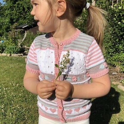 Short sleeved cardigan in combed cotton. Beautiful pattern with stripes, hearts, crowns, leaves and crochet details. Front- and back panels are knitted in one piece, so there are no side seams to sew. The pattern also includes photos, diagrams, sketches of all pattern pieces and a list of abbreviations. The cardigan can be machine washed.