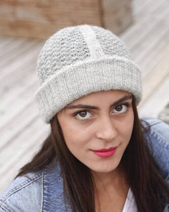 Weather the seasons in comfort with this watchcap beanie that will cocoon you season after season. Combining Baskerville’s delicate crimp with Islington’s sleek shimmer, this timeless design features a solid slip-stitch stripe which punctuates the crown like a ray of sunshine through billowing clouds of textured rib.