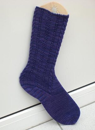 Top-down socks with an alternative gusset shaping. The cables on the front split up to give way for the gusset. The rest of the sock is knitted in stockinette stitch.