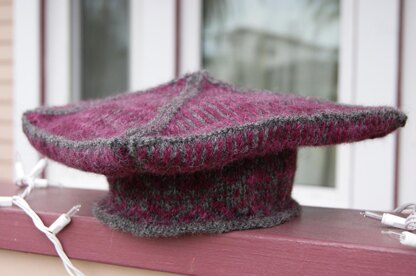 Die Muetze wird vom Stirnbandrand hoch bis zum Beretviereck gestrickt, wo zuerst fuer das Muetzenunterteil 4 mal 2 Maschen in jeder Reihe zugenommen wird, und dann fuer das Muetzenoberteil wieder 4 mal 2 Maschen pro Reihe wieder abgenommen wird.