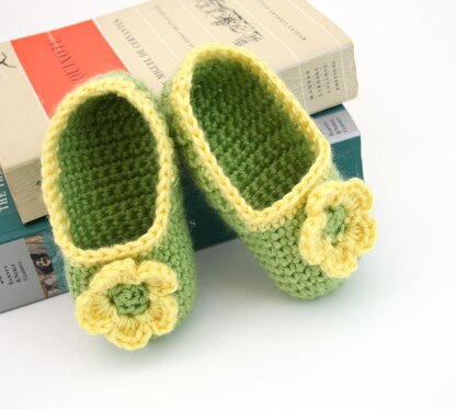 Adorable baby slippers with rounded toe. Large flower accent in contrasting color! Quick and easy to construct! Pattern is detailed and easy to follow!