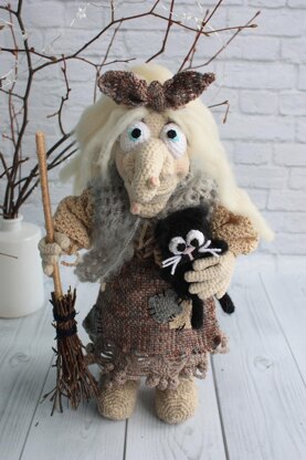 Hello! If you are watching this crochet pattern, it means you love fairy-tale heroes and wish to crochet one of them. This pattern is a very detailed description with many photos how to crochet a good-hearted witch baba Yaga and her beautiful outfit, to make a magic broom with birch twigs and to crochet her best friend – Simon cat.
