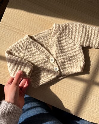 The Baby Aosta Cardigan is an Andalusian stitch top-down raglan cardigan. It is worked back and forth in rows to form the yoke. Once the yoke is finished, you will leave the sleeves to rest and work the body in rows to your desired length. You will then pick up the stitches for the sleeves and work them in the round with some gentle decreases to create a slight taper. I recommend that you finish the body and sleeves with tubular cast-offs, but you can use your preferred method. Finally, you will pick up and knit stitches to form the 1x1 rib button band.