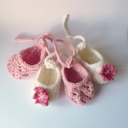 Two styles of baby ballerina shoes- lacy and plain with a picot flower embellishment. Knitted in Patons Dreamtime Double Knitting. 6 sizes given to fit 0 - 2yrs.