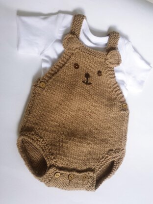 This cute, DK weight romper has a bear face embroidered into the front section. The romper is worked mostly in stocking stitch with a garter stitch hem and a 4 stitch border at each side. The back has a G St waistband that extends round to the front to fasten with buttons on each side and straps fasten at front with buttons that are hidden behind the ears.