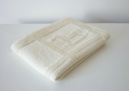 New baby blanket pattern "George" with rocking horses, this blanket is easy to knit as it is knitted in knit and purl stitches.