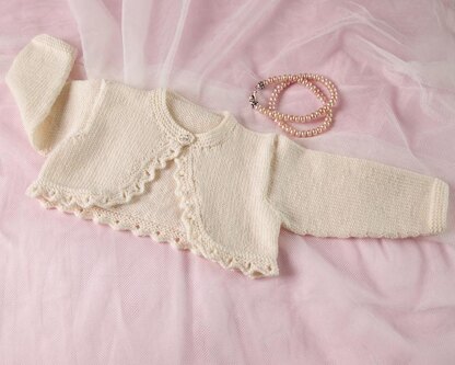 This little bolero is just the ticket over a sweet little summer dress. It is knitted in soft baby merino yarn which is machine washable. The edging is knitted afterwards and sewn on. One little button closes this design at the round neck.