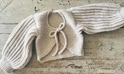 This stunning knitted baby bolero is one of our best sellers and it’s become a SnugaBug staple, either in its classic form or with appliques added to it. The bolero is knitted in separate pieces and seamed together so can be made on straight or circular needles. The sleeves are made in half fisherman’s rib (although you could change this to full fisherman rib if you prefer, and the chunky yarn means these boleros work up relatively quickly. The attached i-cord finishes off this little bolero perfectly in a cute bow at the front.