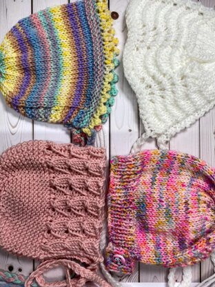 The bonnet collection contains a fan and feather bonnet, a bluebell rib bonnet, a plain chin strap bonnet (suitable for any gender) and a sweet picot edge bonnet.