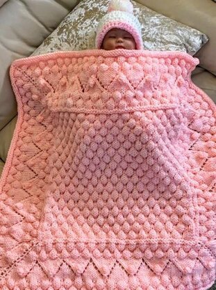 *BABY BUBBLES* is an easy blanket to knit, but maybe not for a very new knitter. A centre square with sides added and stitched together. Clearly written with added photos.