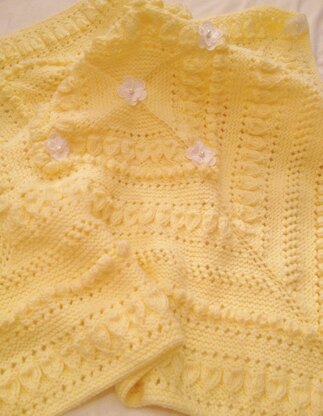 BABY BUTTERCUP is knitted in baby soft Aran weight yarn , so cozy for winter babies. The finished size is approx. 36x36ins/92x92cms, It is worked in 4 triangles and sewn together at the end. I have decorated mine with guipure lace daisies, but this is entirely optional. The textured patterns looks harder than they are and are super easy to pick up and remember