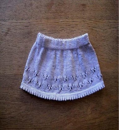 A girl's knee length skirt with a picot hem and waistband and a cute little butterfly motif at the hem.