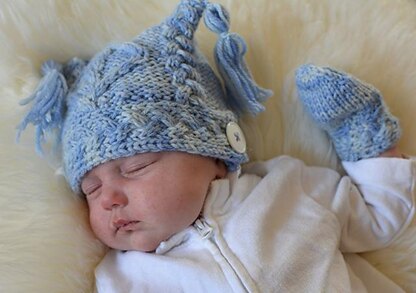 These patterns are a complete baby set with hat, mitten and baby booties. Of course, this set features cables! All three patterns begin with a cable strip. Stitches are picked up around the cable strip to knit the hat, mittens or socks. All of these patterns are knit in the round. The hat needs kitchener stitch to join the top.