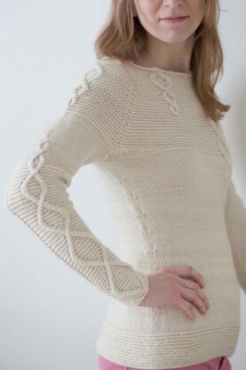 This beautiful and original garment combines modern vanishing cables and two all time classics, garter stitch and stockinette. It’s beautiful and unusual and never goes out of style. The sweater is worked seamlessly from top-down and requires minimal finishing.